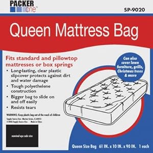 Heavy duty, tear resistant polyethylene cover for all mattress sizes. Protects against dirt, mildew, and water damage. The large style bag slips on and off easily. No. SP 9020